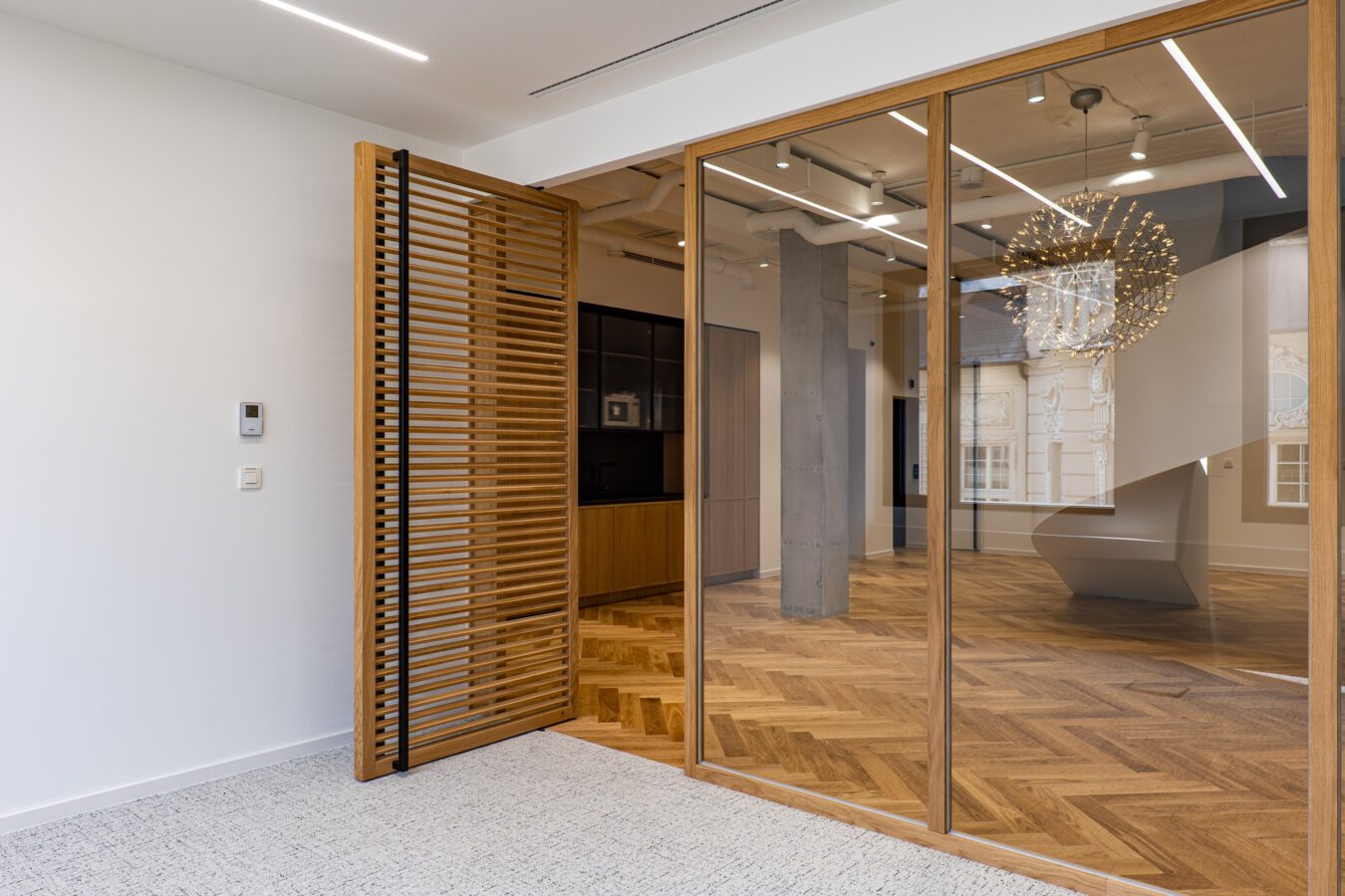 Interiérová příčka s dřevěným profilem MADERA představuje nadčasové řešení pro jakýkoliv prostor a styl. Dřevěné profily příček interiér zútulní a dodají mu nenapodobitelnou eleganci, což oceníte především v kancelářských prostorech, které často působí chladně, až sterilně.